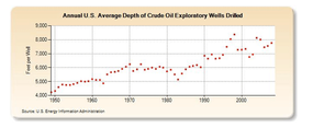 How deep must we drill to reach this precious black gold? Over the past sixty years, the depths have only increased. In 1949, the first year with available data, the average depth of drilled oil wells was 3,635 feet. By 2008, the latest data available, this had risen to 5,964 feet, a slight decrease from 2007's 6,064 feet.