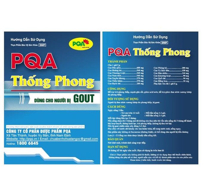 PQA Thong Phong is manufactured by PQA Pharmaceutical Joint Stock Company, known for researching and producing products made from rare and natural medicinal ingredients. This product is made from completely safe herbal extracts that help to treat rheumatism, strengthen bones and joints, reduce uric acid, and alleviate joint pain caused by conditions like gout and rheumatism.