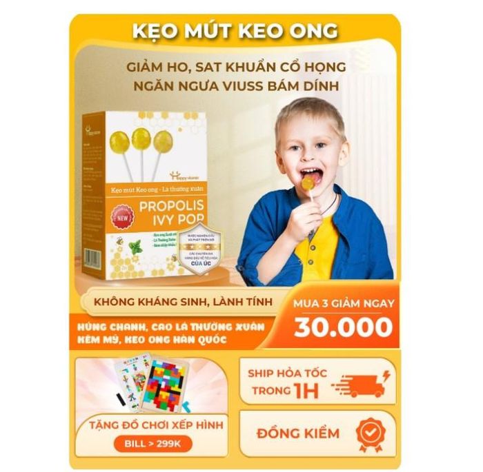 Honey Propolis Lollipop - Happy Vitamin provides essential vitamins for children using exclusive technology from South Korea. With a delicious taste that kids love, these lollipops are made from natural ingredients with no side effects and are suitable for daily use. In addition, green propolis, ivy leaf, and lemongrass in the lollipops help protect the respiratory system, and effectively fight against viruses and bacteria.