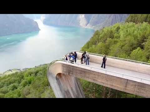 The Aurlandsfjord in Norway offers breathtaking views, and the Aurland Lookout Tower, or Stegastein, provides a unique perspective from 650 meters (2,135 feet) above. This viewing platform, made of steel and clad in pine, extends 30 meters (100 feet) before ending with a glass panel that gives the sensation of hovering over the fjord below.