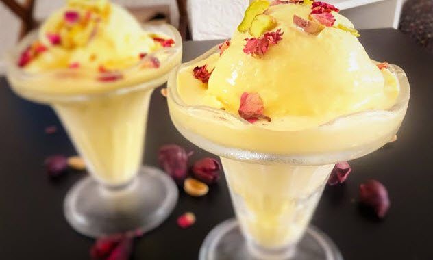 Bastani sonnati, or “classical ice cream,” is a Persian (or Iranian) treat flavored with rosewater, often enhanced with saffron, vanilla, and/or pistachios. Its most distinctive feature is its chewy, stretchy texture, achieved by adding salaab, a thickening agent derived from wild orchids.