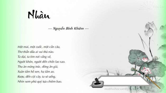 - For example: "Nhàn" is a poem that showcases the integrity of a person who loves nature, values simplicity, and enjoys the serenity of a modest life.