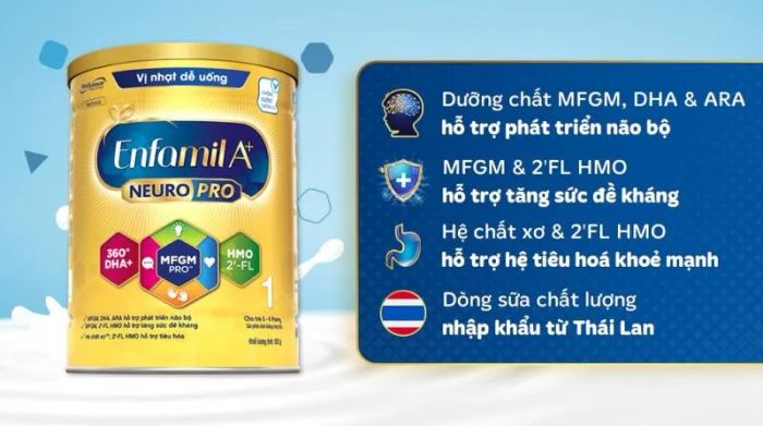 Enfamil A+ NeuroPro 1 provides essential nutrients for both cognitive and physical development, making it ideal for infants aged 0-6 months. During the first 1-3 years, babies require vital nutrients to support their physical growth and mental abilities. Therefore, in addition to regular meals, mothers should supplement their child's diet with nutrients like DHA, ARA, Choline, MFGM, and other essential components to ensure their baby is healthy and sharp enough to explore the world.