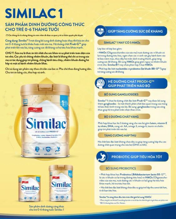 Similac 1 is a formula designed to supplement or replace meals for babies aged 0-6 months who are lacking breast milk. The Prodi-GTM nutrient system promotes brain development, boosts immunity, and supports a healthy digestive system.