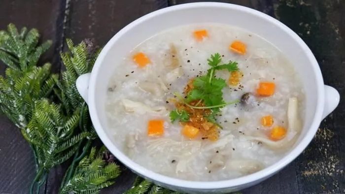 - Cook the porridge: Steam the yam and carrot. Sauté the garlic until fragrant, then add the mushrooms and stir-fry with seasonings. Add the sautéed mushrooms to the porridge and adjust the seasoning. Next, add the steamed yam and carrot and pour in the coconut cream. Bring to a simmer, then reduce heat and cook until the porridge reaches the desired consistency. Garnish with spring onions, coriander, pepper, and fried shallots to enhance the flavor.