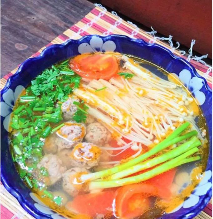 - Cook the soup: Add 1 liter of water to the pan with the cooked tomatoes and bring it to a boil. Once boiling, add the meatballs one by one, along with 2 teaspoons of seasoning powder, MSG (if using), 2 tablespoons of fish sauce, and let it simmer until the meatballs float to the top.