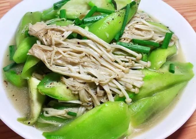 - Cooking the dish: Heat a pan on medium heat, add 1 teaspoon of cooking oil. Once the oil is hot, add the shallots and minced garlic and stir-fry until fragrant. Add the loofah pieces and cook until they soften. Then, add the enoki mushrooms and stir-fry together. Season to taste, and cook until the mushrooms and loofah are tender. Finally, add the spring onions and a dash of pepper, stirring well before turning off the heat.