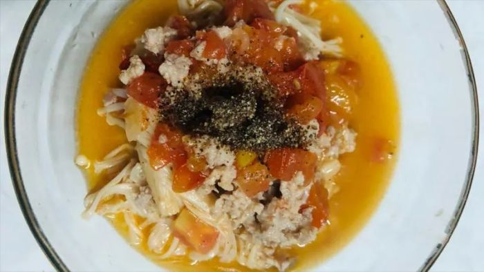 1. Stir-Fried Enoki Mushrooms with Ground Pork and Tomatoes
