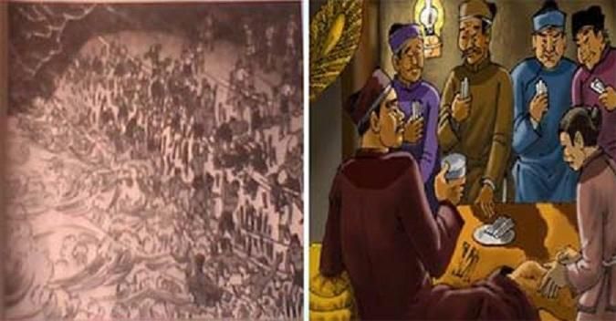 He is inside the communal house, about 400 meters away. The house, though located on the dike, is high and solid, unaffected by the flooding outside. In this second scene, the author describes the official engrossed in playing cards with his subordinates while being served by clerks and soldiers. The narrative is objective and detailed, but behind it, the tone carries irony, mockery, and indignation.