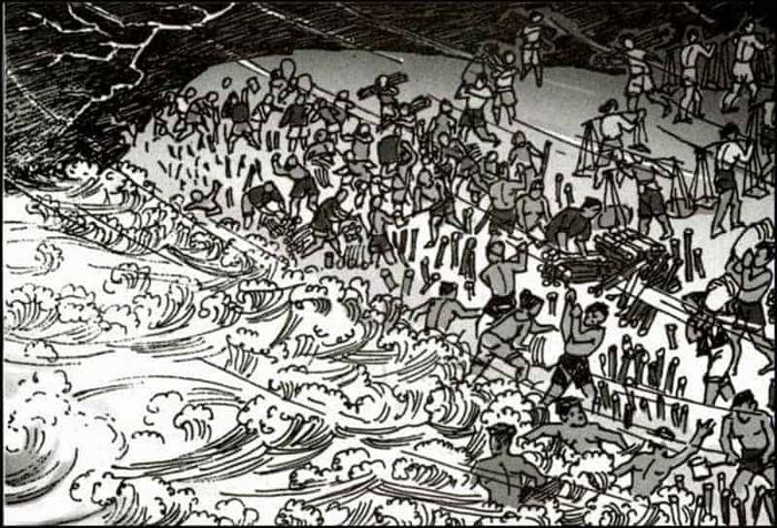 It is a rainy night, and the river’s rising waters threaten to breach the dyke. Armed with crude tools, the farmers—muddy and soaked—take various stances: some carry hoes, others haul bamboo, while some wade through the water, drenched like rats, all united in their effort to combat the flood. This somber and painful image tugs at the reader’s heartstrings.
