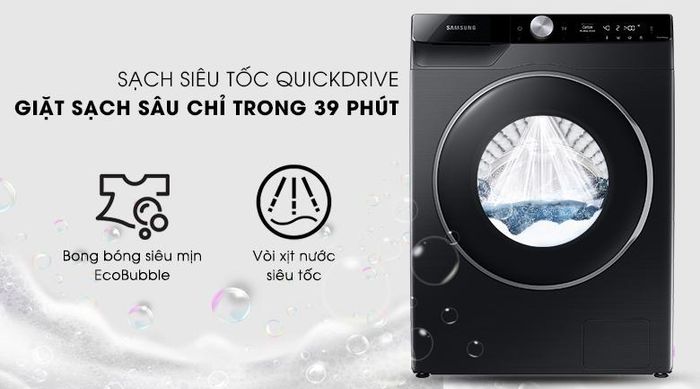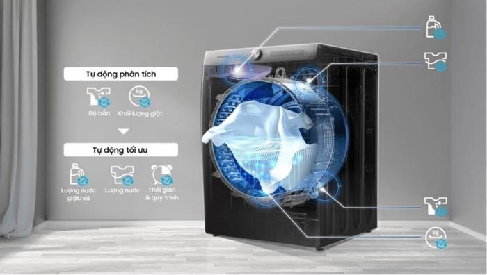 With the AI Control panel, the washing machine learns your family's washing habits and suggests the most appropriate settings for future washes. The display shows the wash cycle and provides helpful instructions in Vietnamese, and it can be controlled remotely through the SmartThings app. EcoBubble technology creates super-fine bubbles that quickly penetrate fabric fibers, cleaning clothes 24% more effectively and preventing detergent residue. Plus, the cold water wash cycle minimizes damage, preserving fabric color and quality by 45% while saving up to 70% energy.