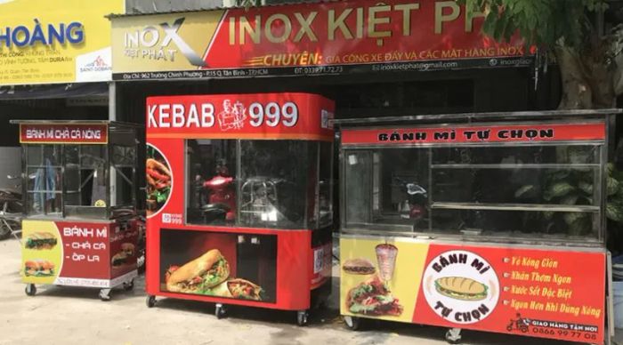 Inox Kiệt Phát specializes in providing high-quality mobile food trucks, including Turkish sandwich trucks, fish cake trucks, sandwich-on-a-stick trucks, milk tea trucks, coffee trucks, rice cabinets, and roasted pig cabinets, all made from durable stainless steel and iron. These trucks come in various designs and sizes, and custom orders are welcome.