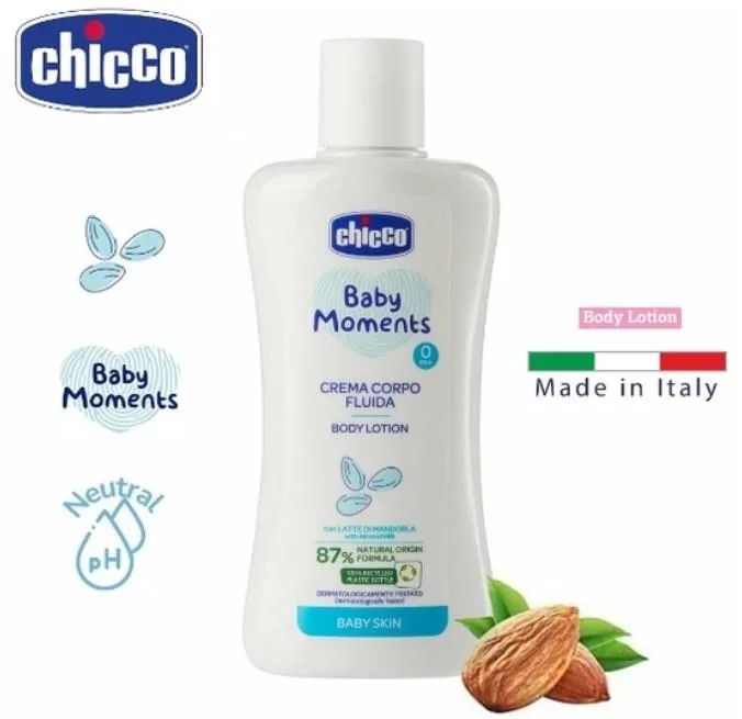 - The Chicco Almond Extract Body Lotion with sweet almond oil, Glycerin, softens and smooths your baby’s skin.