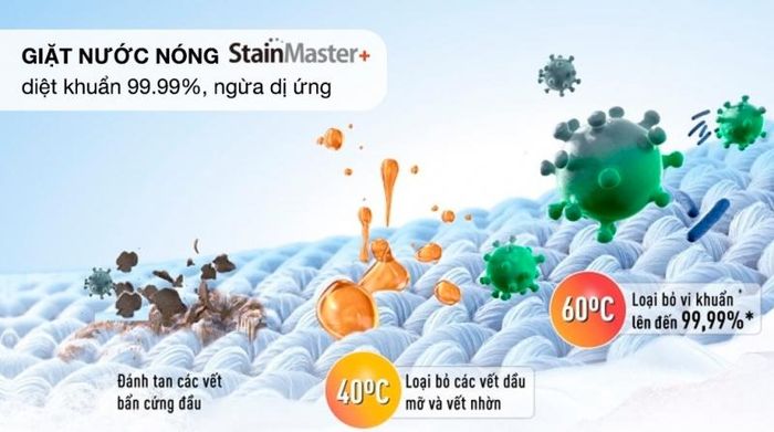 - Hot water wash with Stain Master+ eliminates 99.99% of bacteria and 99% of allergens.