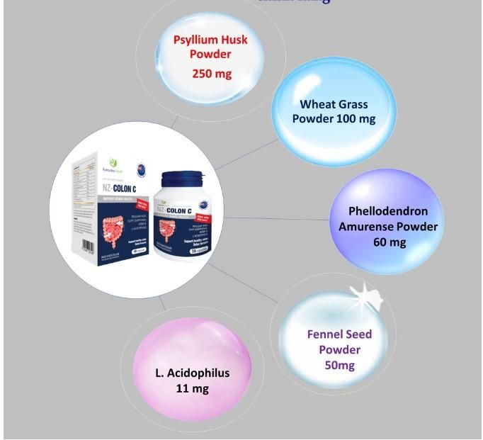 Everyday Health NZ-Colon C Capsules combine premium ingredients such as Psyllium Husk Powder, Wheat Grass Powder, Phellodendron Amurense, Fennel Seed, Alfalfa Leaf, Papaya Leaf, Ginger Root, L. Acidophilus, and 5-Hydroxytryptophan (5-HTP). These components have long been used to support the relief of digestive disorders associated with colon health issues like acute and chronic colitis, irritable bowel syndrome, as well as easing constipation, indigestion, and frequent bowel movements due to colon dysfunction.