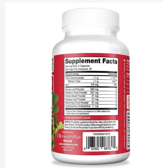 - Psyllium Husk Powder, Senna Leaf Powder, Fennel Seed, Papaya Leaf, Peppermint Leaf, Buckthorn Bark, Celery Seed, Barberry Root, Rose Hips, Acidophilus, Iron, Gelatin.