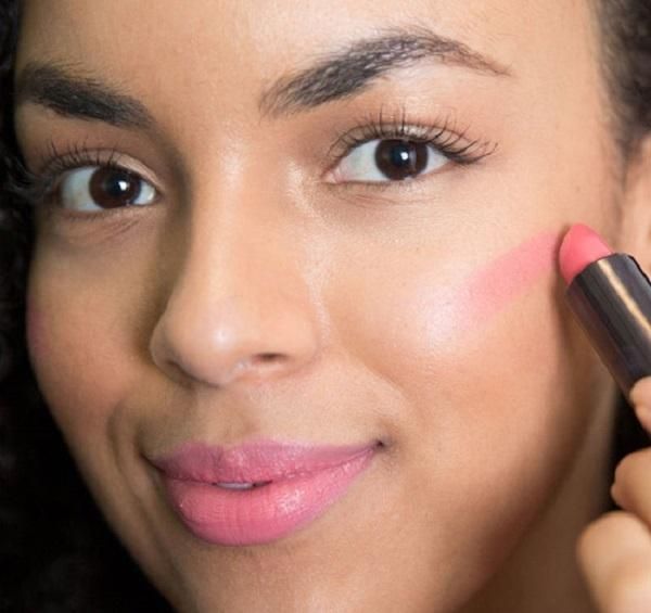 If you're ever in a pinch and don't have blush, you can easily use your lipstick as a substitute. Simply swipe a line diagonally across your cheekbones and blend it out with a brush for a natural finish.