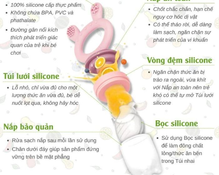 - The special silicone bag has small holes that make it easier for babies to chew and allows juices and nutrients to flow easily into their mouths.