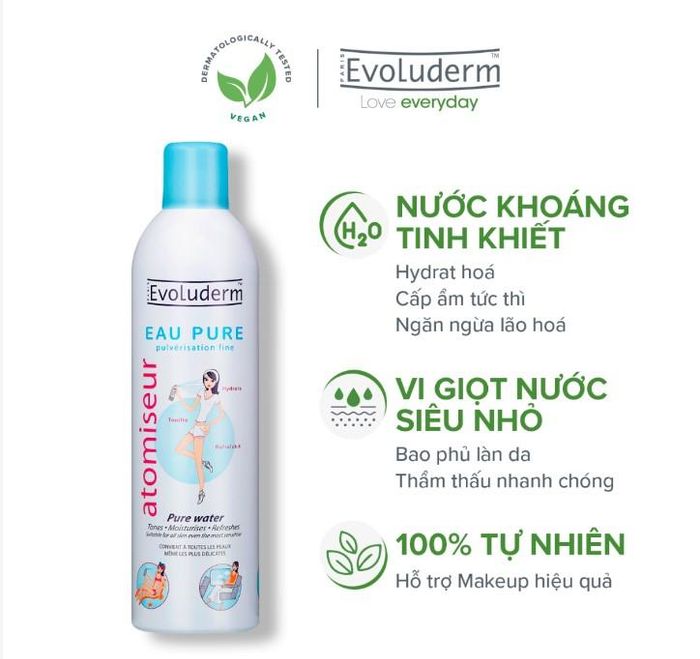 - Evoluderm is a French brand that has become famous for its diverse range of high-quality beauty and body care products at competitive prices. Manufactured and packaged in France in GMP and ISO 9002 certified laboratories, Evoluderm Atomiseur Eau Pure Mineral Spray is one of the best sprays for both facial and body skincare.