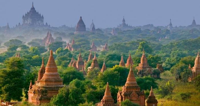 Bagan is renowned for its grand Buddhist temples, many of which were built by kings. With 2,220 temples still standing today, the area offers ample opportunities for exploration. The temples are located close together, allowing visitors to travel by walking, bicycle, bus, tuk-tuk, or even hot air balloon. The Ananda Temple, one of the largest and best-preserved, was built in 1105 to represent the supreme wisdom of the Buddha. The temple, made of stone, has a cross-shaped architecture with a central cubic structure and statues of standing Buddhas on each side. The building’s spires culminate in sharp, tapering peaks known as shikhara, and the exterior walls are adorned with colorful glazed tile mosaics illustrating scenes from the Jataka tales.