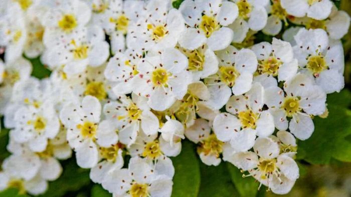The golden stamens, the white flowers, and the green leaves.