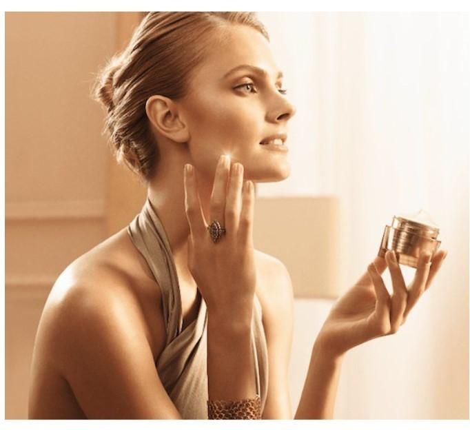 - Apply five dots of cream on the face and gently massage in circular motions from bottom to top, inward to outward, patting lightly for absorption.