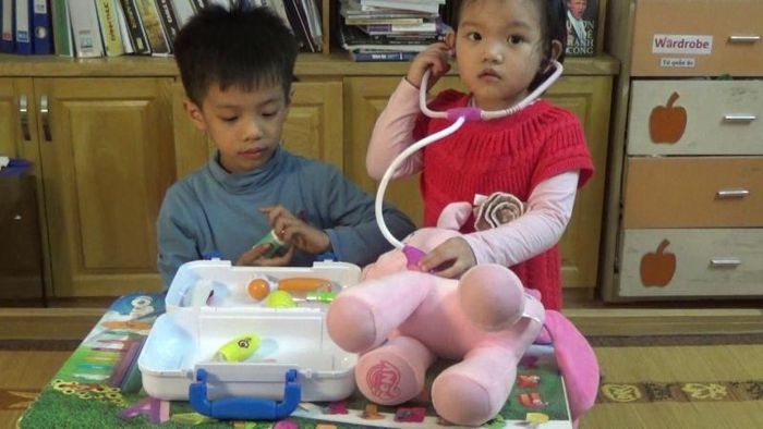 The teacher assigns children to play the role of a veterinarian, examining animals. This game also helps children learn terms related to body parts through their play.