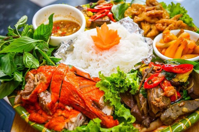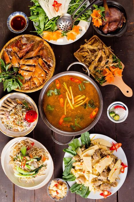 During the chilly end-of-year days, nothing beats gathering with family and friends to enjoy aromatic duck dishes after a long day of work or study. Their duck set options start at 79,000 VND per person and include: 2-person set: Roasted duck, de-boned duck feet salad, boiled entrails, bamboo shoots, noodles. 4-person set: Roasted duck, fried ginger duck, de-boned duck feet salad, boiled entrails, bamboo shoots, noodles. 6-person set: Roasted duck, boiled duck, fried ginger duck, crispy duck tongue, smoked duck breast, de-boned duck feet salad, bamboo shoot soup, boiled entrails.