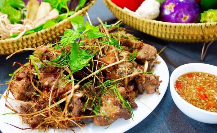 When you visit Hồng Dũng Quán, you cannot miss two of their most beloved and delicious dishes: duck blood soup and roasted duck. The roasted duck is legendary for its irresistible aroma, with golden-brown skin that crisps up on the grill. The duck is split in half, grilled over red-hot charcoal, rotating until it achieves a perfect golden hue. It’s best enjoyed hot, with crispy skin and tender meat, seasoned with a special family recipe. It’s served with a rich dipping sauce that completes the flavor profile of Vân Đình grass duck perfectly.