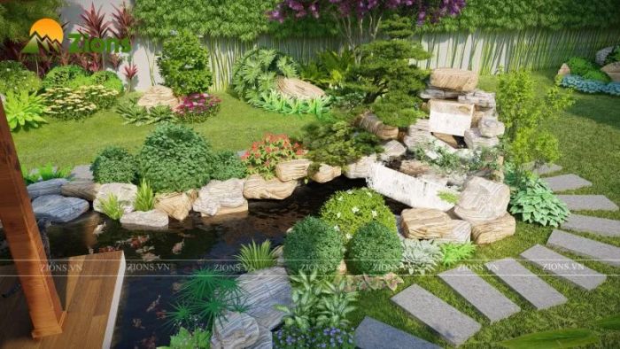 - The landscape exudes natural colors, blending harmoniously yet delicately, with simple but captivating rocks, appropriate plants that complement the pond, and waterfalls that make a bold statement.