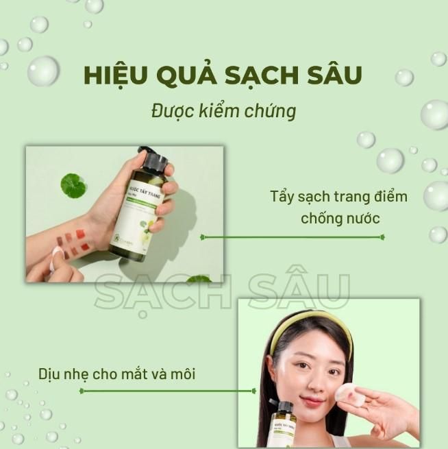 - Làm sạch lớp bụi bẩn, dầu thừa, cặn trang điểm nhẹ nhàng, không gây đau rát da, trả lại làn da ẩm mịn, thông thoáng.