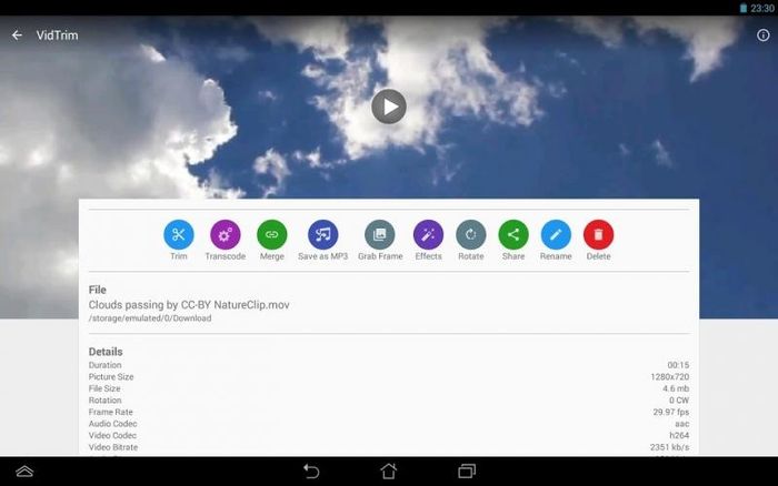 VidTrim is a powerful video editing app that works efficiently on Android devices. You can cut, merge, convert, capture frames, and more. One of its standout features is the ability to reduce video resolution, making it easier to upload high-quality videos to Facebook and other social media platforms. Additionally, VidTrim lets you directly share your edited videos with friends through the app.