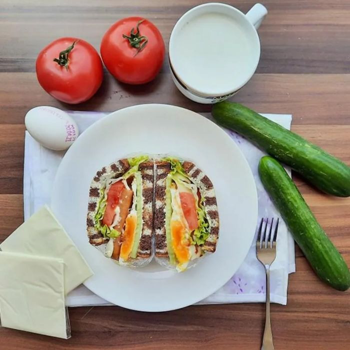 - Next, add the fried egg and cucumber slices, followed by a dollop of mayonnaise.