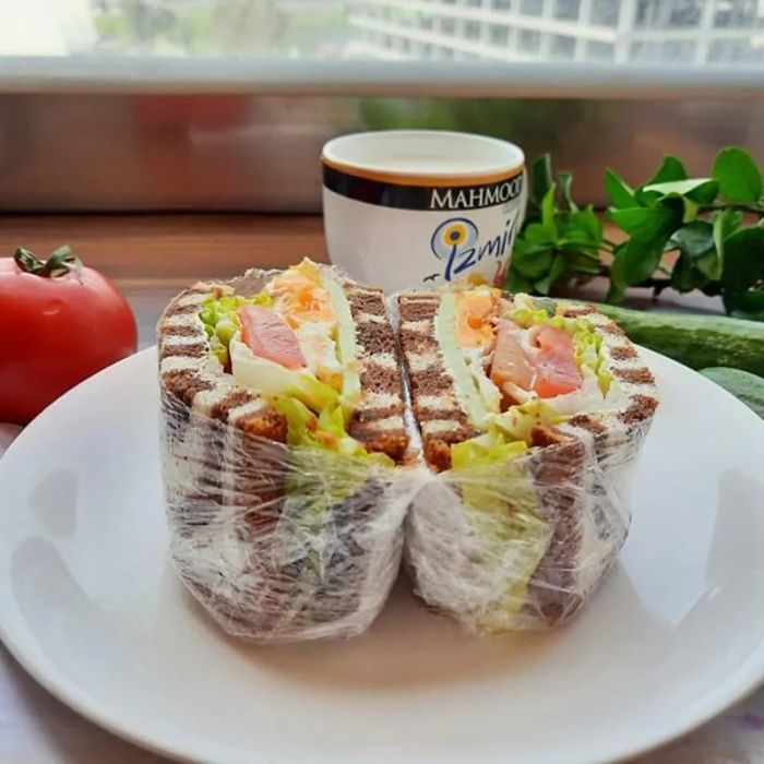 - Top with the second slice of bread, press gently, and wrap it tightly in the plastic wrap. If needed, wrap it again for extra security. This method is perfect for taking your sandwich to work.