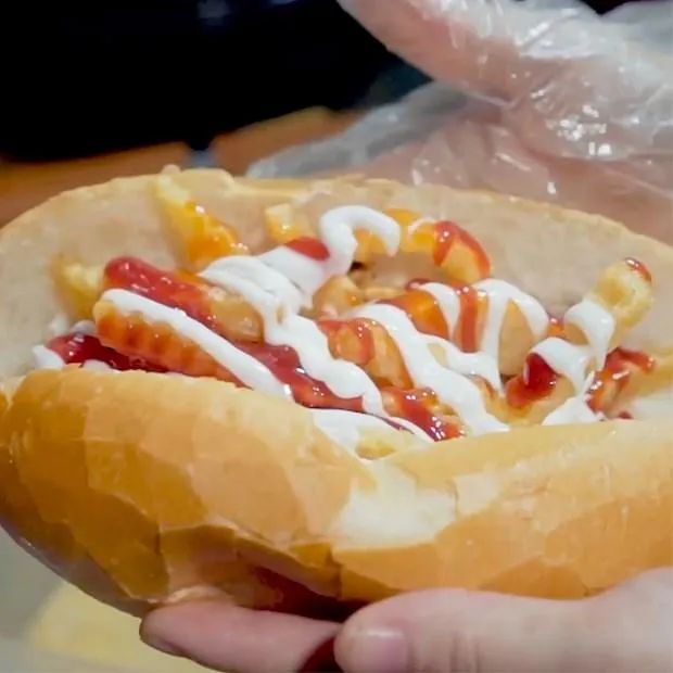 - Slice the bread rolls, then add the fried potatoes and sour rolls inside. Drizzle with a bit of chili sauce and mayonnaise, and your sandwich is ready to enjoy!
