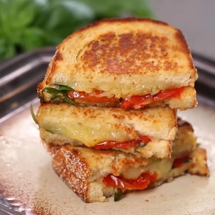 - On the unbuttered side of the bread, place a slice of cheddar cheese, some of the roasted tomatoes, and a few fresh basil leaves. Top with the second slice of bread, buttered side facing out.