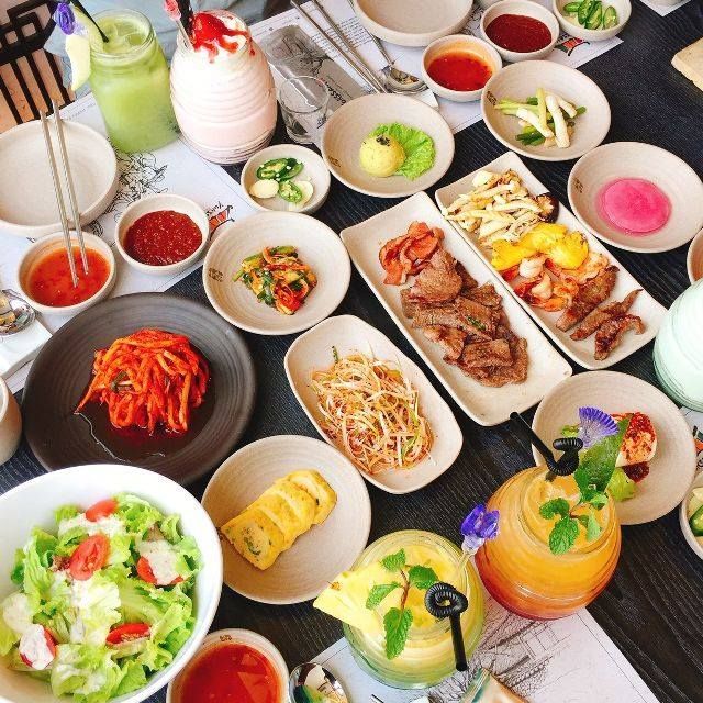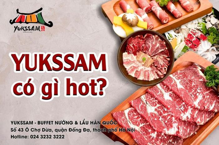 Located on Ô Chợ Dừa Street, Yukssam features a striking storefront with large glass windows and a curved tiled roof that immediately evokes traditional Korean architecture. The interior follows the same theme, creating a uniquely Korean atmosphere. Along with its cultural setting, the restaurant’s menu captivates guests with the authentic flavors of Korean cuisine. While both the buffet and à la carte options are available, it’s the enticing aroma of the grilled dishes that truly beckons customers.