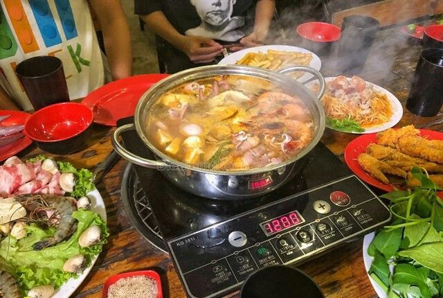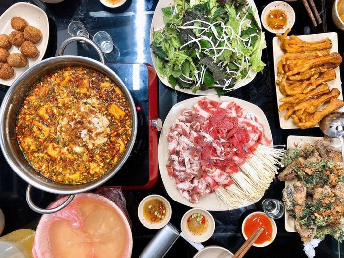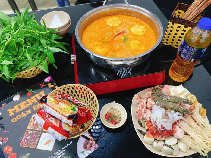 Aside from the grilled items, Lẩu Nướng Đường Tàu also offers a delicious hotpot. The hotpot set, priced at 390k, includes a variety of fresh dipping ingredients such as shrimp, squid, octopus, beef belly, clams, and tofu. The broth is flavorful, perfectly balancing sweet and sour notes, and its fragrance is irresistible. Not only are the grilled meats fresh, but the seafood served with the hotpot is also incredibly fresh. The restaurant is located near the railway tracks, so access is a bit tricky, but you can either cross the tracks or park at the nearby park and walk over.
