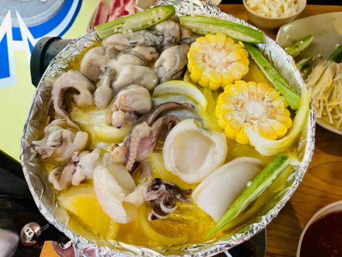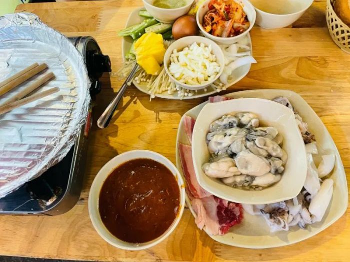 One of the standout features of this restaurant is the creamy, aromatic cheese, which pairs beautifully with the beef, adding extra richness. The spicy sauce ensures that the dish isn't too greasy or overwhelming. Ingredients are served on separate plates, and diners can cook the ingredients themselves by melting butter in the pan, adding beef, sauce, onions, mushrooms, eggs, oysters, and squid. The dish features top-quality cuts like American flank steak, along with mushrooms, oysters, cheese, and a special spicy sauce that come together for a remarkable dining experience. Despite the restaurant being busy, the dishes are served quickly, and the staff is friendly and helpful, ensuring a smooth experience.