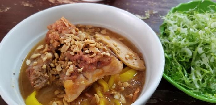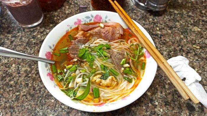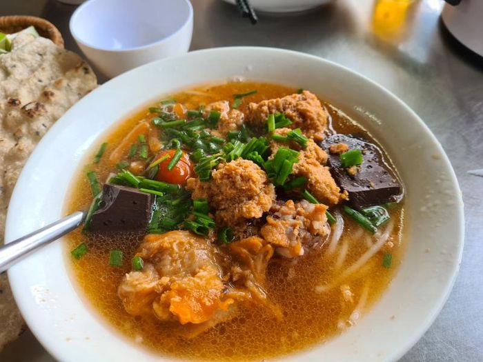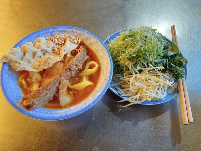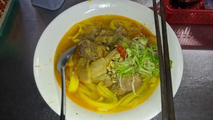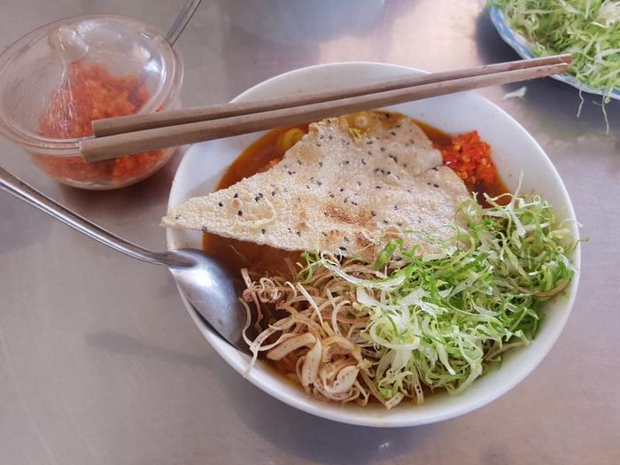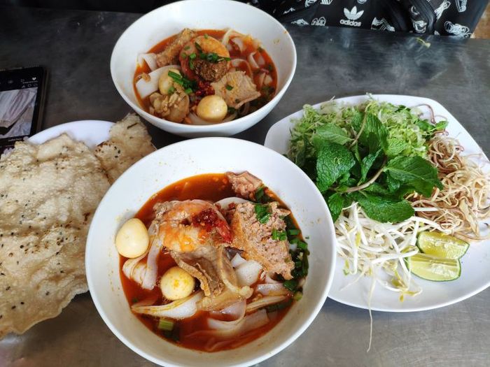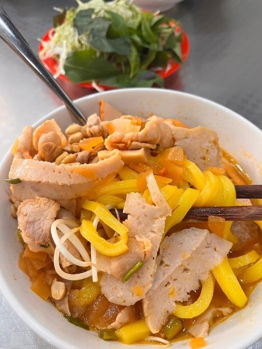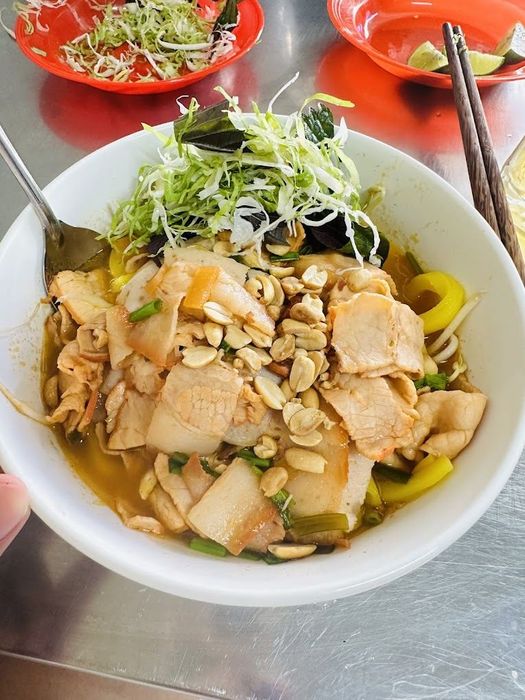 Mì Quảng Bà Lòn is a famous spot in Da Lat, known for its incredibly delicious Mì Quảng dish. With over 10 years of experience, the owner has perfected the art of making flavorful Mì Quảng bowls, where the seasoning is carefully crafted to add a refined touch. The golden-red broth and toasted bread pieces add an appealing visual to the dish. The ingredients used in Mì Quảng Bà Lòn, such as dried shrimp, pork, fresh bamboo shoots, herbs, and the signature fish sauce from Central Vietnam, contribute to the rich, hearty taste and a beautifully arranged dish that is prepared right in front of you, enhancing its flavor.