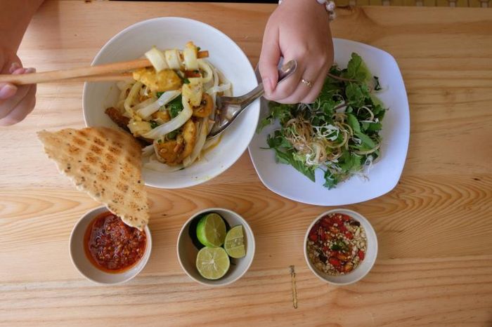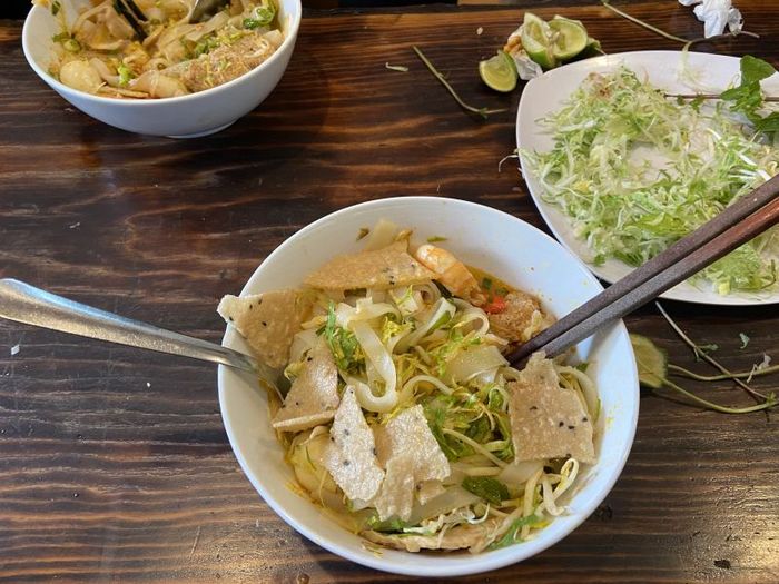The broth is perfectly portioned—neither too much nor too little—with a layer of golden fatty oil on top to enhance the flavor. The mì Quảng here is savory, with a fragrant, rich broth. The restaurant also serves a side plate of fresh vegetables, including banana flowers, bean sprouts, chili, and lime, making the meal even more inviting. If you haven’t tried this special version of mì Quảng yet, you should definitely come and enjoy it. The restaurant takes great care in preparing the fresh herbs and vegetables, ensuring they are cleaned gently to prevent bruising. Overall, Mì Quảng - Ánh Sáng Village is a fantastic recommendation for anyone looking to try this dish!