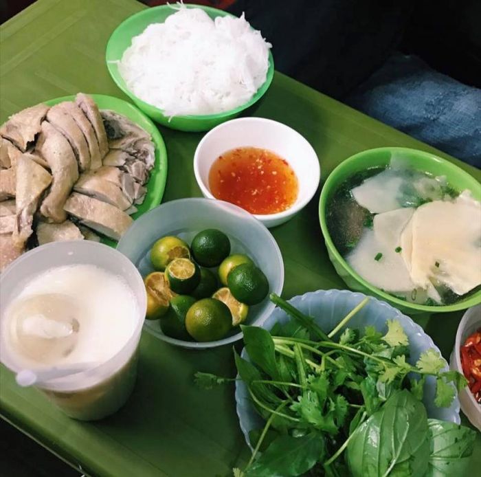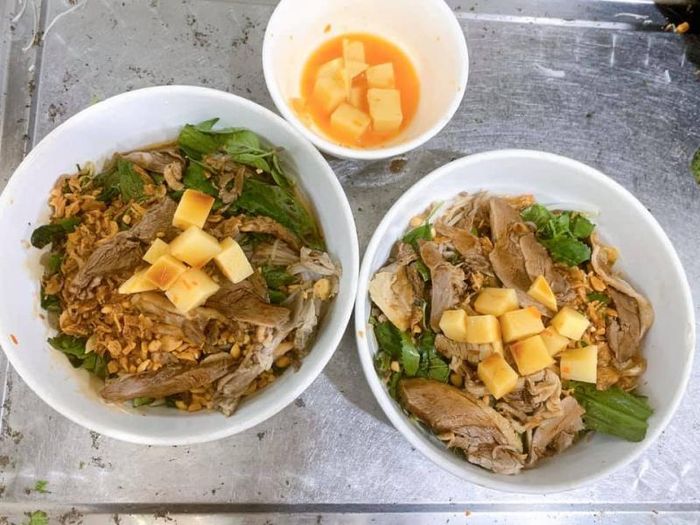 Don't worry about finding the shop, as although it doesn't have a number, it’s located in a small alley, famous for its many tasty eateries. Nhan Duck Noodles sets up a few small tables right on the sidewalk, with customers lining up eagerly and even occupying the café across the street. The noodle bowls here are loaded with meat, with the broth standing out for its deliciously sweet flavor, and the duck meat is tender. It's served with a side of salt, lime, and chili. If you arrive late, you can enjoy the "bones-only noodle" with a large bowl of bones for just 10,000 VND. The café across the street also offers a refreshing lotus-scented coconut drink worth trying.