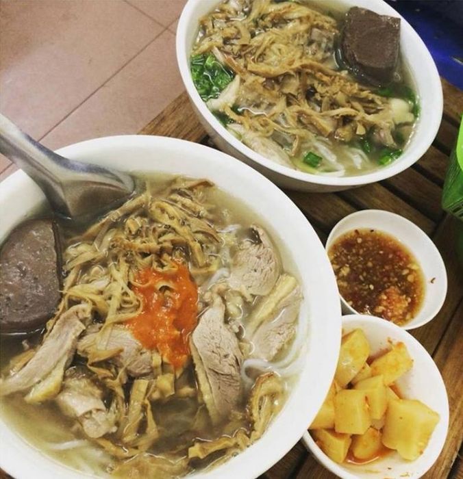 Despite the crowds, the staff here is quick and efficient, ensuring fast service. The roasted duck is expertly chopped, with each piece retaining its golden color and served with a tangy, mildly spicy dipping sauce that complements the duck perfectly. A typical bowl of duck noodles here costs between 35,000 and 50,000 VND, while a plate of perfectly chopped duck meat is priced around 120,000 to 150,000 VND. For larger groups, the owner often offers complimentary bamboo shoots with duck blood, making it even easier to enjoy a delicious meal. As a result, this spot is a top choice for those craving tasty, budget-friendly late-night duck dishes.