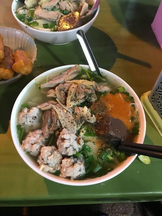 The broth of the goose noodles is considered the 'soul' of the dish, offering a sweet flavor from the simmered bones and a distinct taste of the goose. A full bowl here includes dried bamboo shoots, fresh bamboo shoots, meatballs, and shredded goose meat. The bamboo shoots are chunky, sliced thinly, and paired with smooth, tender blood pudding. The broth is flavorful, clear, and free of greasy residue, with a refreshing sweetness. Don’t forget to order the plate of chopped goose served with a special sour-sweet sauce. The restaurant is usually crowded in the evenings, so it's best to come early to avoid waiting or losing a seat.