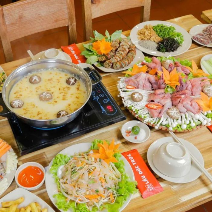Hot pot has long been a beloved dish for gatherings and family get-togethers. Sitting together around a steaming, fragrant pot of hotpot, chatting and enjoying the warmth in the chilly winter air has become a cherished tradition among Vietnamese people, particularly in Hanoi. The menu at Bia Đức Trọc offers a variety of delectable dishes, including: grilled snakehead fish, roasted suckling pig, grilled chicken, river crab hotpot, pigeon hotpot, and crab and beef hotpot. The talented chefs at this restaurant turn these familiar ingredients into creative and delicious dishes that leave guests delighted.