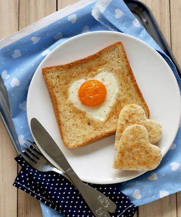 - Step 2: Heat 2 tablespoons of oil in a pan, then place the bread into the pan. Crack the eggs into the center of the heart-shaped bread and fry them until cooked.