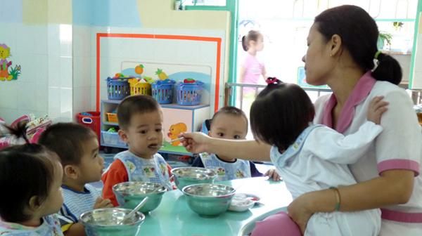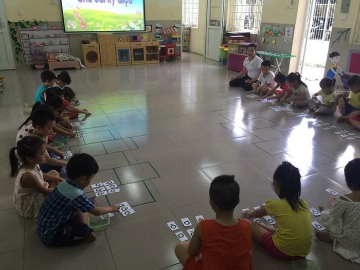 - The children sit on the floor. The teacher distributes seeds to each child. The teacher arranges the first letter as an example for the children to see and guides them to follow the order of writing the letter strokes: from top to bottom, left to right (the teacher may demonstrate twice).