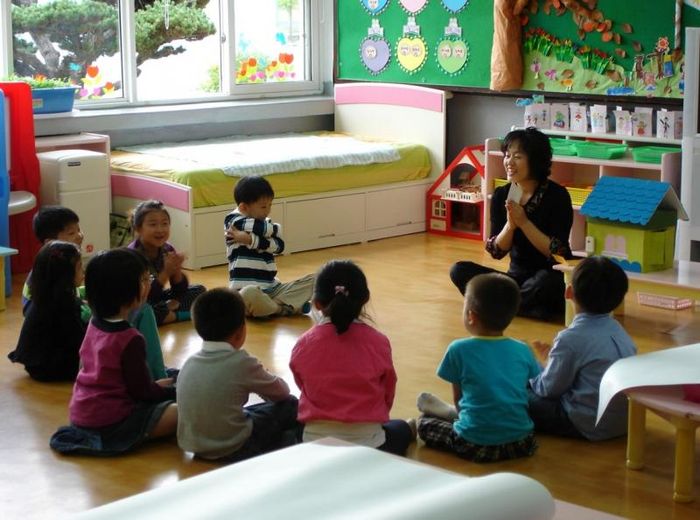 The teacher encourages the children to play, observes, and corrects any mistakes.