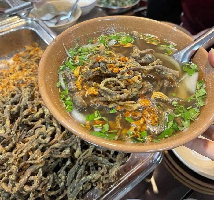 The eel vermicelli at Nghệ Specialty Eel Restaurant is priced at three levels: 30,000 VND, 40,000 VND, and 50,000 VND. The ingredients are carefully chosen, including high-quality dry foods like cassava vermicelli, shiitake mushrooms, and dried bamboo shoots, combined with golden, fatty eel pieces that are incredibly enticing. Besides eel vermicelli, the shop also offers crispy eel separately, making it a perfect snack or take-home treat. The restaurant is open all day, from morning to night.