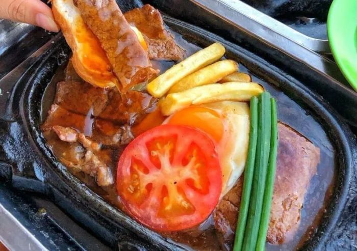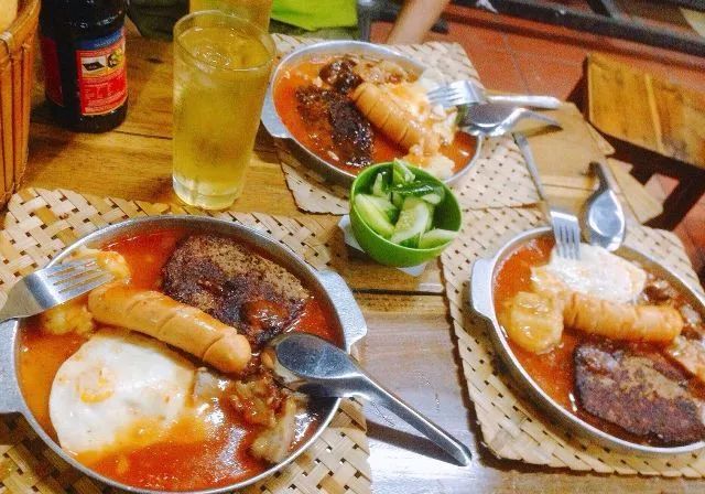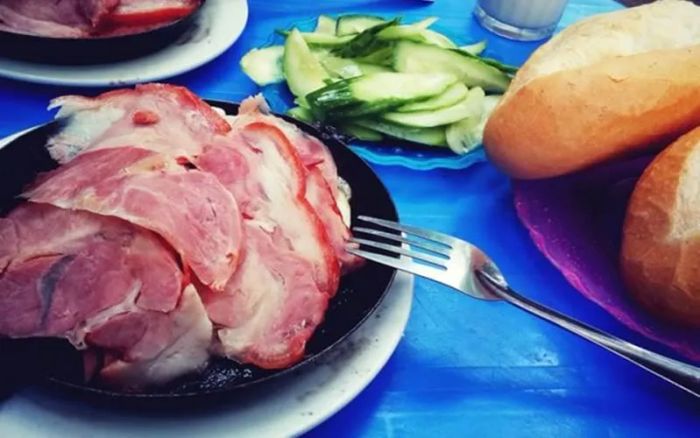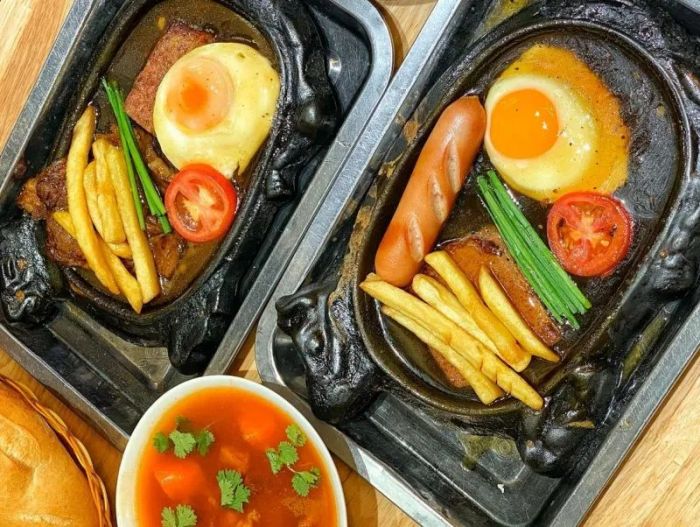 Enjoying Ô Long Sizzling Pan Bánh Mì – Hồ Đắc Di is sure to leave you impressed. The restaurant stands out with its legendary sauce that’s so addictive, the more you dip, the more you crave. Each serving comes with plenty of sauce to dip your bread in, and the full portion includes crispy sausages, pâté, fried eggs, steak, and French fries. It’s complemented by fresh scallions, ripe tomatoes, and cucumber on the side, making it even more appetizing.